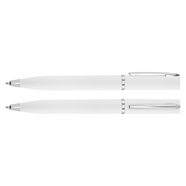Fino bolígrafo Metálico blanco modelo «Trooper», con terminales metálicos. Diseño simple y moderno. Escritura negro.Regalar bolígrafos ejecutivos como obsequio promocional genera reconocimiento y fidelidad de marca al ser un artículo útil y duradero que mantiene tu logo visible diariamente, proyecta una imagen de calidad y prestigio, fortalece relaciones comerciales con clientes y socios, y es una forma económica de publicidad constante, especialmente en eventos, asociando tu marca con profesionalismo y aprecio. Se convierte en un recordatorio constante de tu empresa en escritorios, reuniones y en el día a día, aumentando la recordación de tu logo y eslogan.