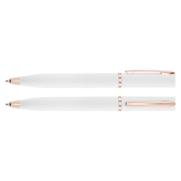 Bolígrafo metálico de cuerpo blanco y detalles electro plateado en color cobre. Acabado brillante.