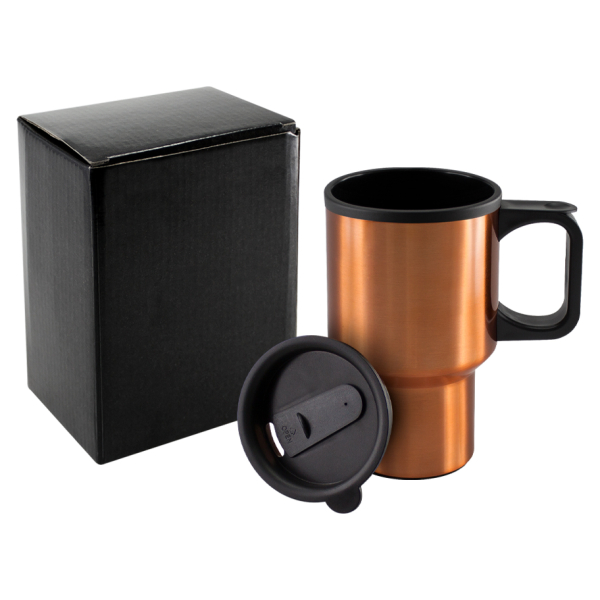 Mug metálico color cobre electro-plateado. Presentación en bolsa plástica dentro de caja de cartón negra. 600 ml. Interior y tapa de plástico. Incluye silicona antiderrame.