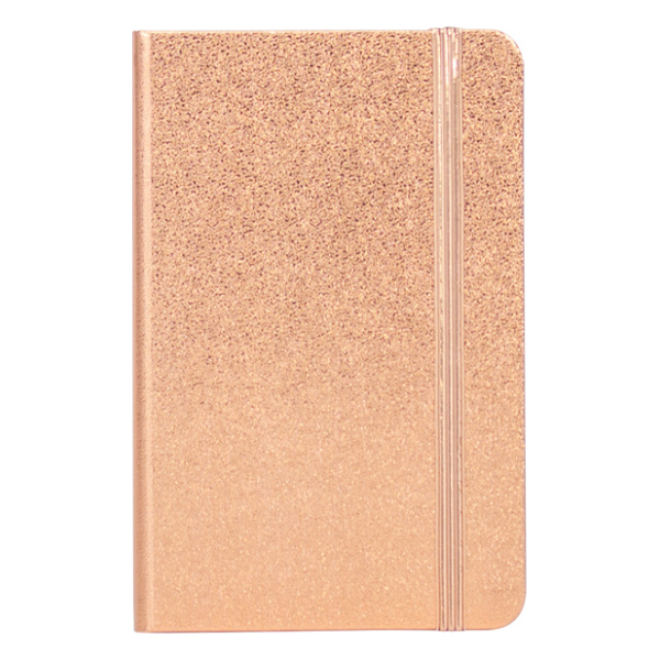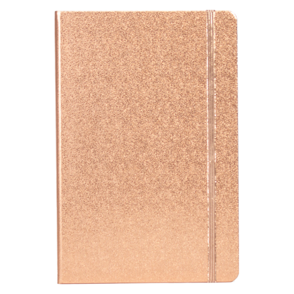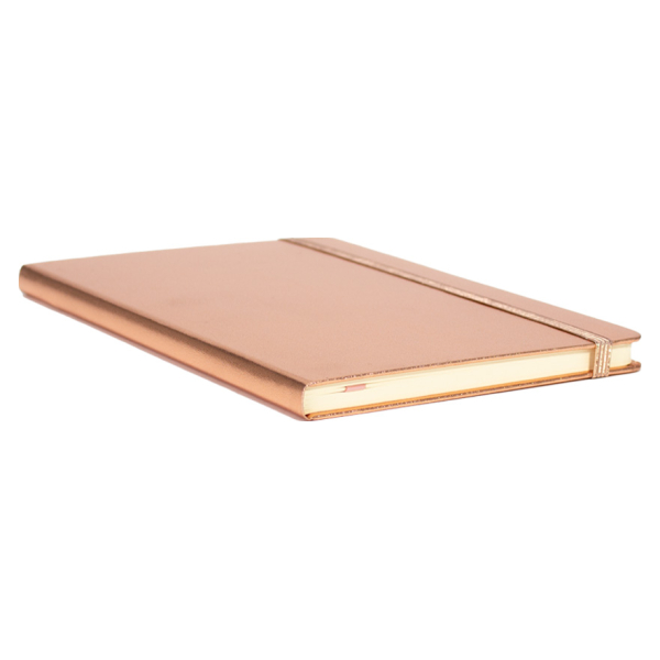 Cuaderno tamaño A5, con cubierta de cartón piedra forrada en PU color cobre de 1.5mm de espesor, interior 80 hojas amarillas lineadas de 80 gs. Incluye banda elástica y huincha separador de hojas al tono. Presentación individual en bolsa de polipropileno translúcido. Tamaño: 14.2 x 21.4 x 1.3 cm.
