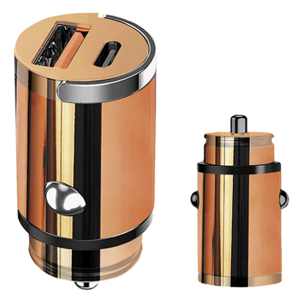 Adaptador metálico para automóvil electro plateado en cobre. Entrada USB-A. Presentación en caja de cartón negra.