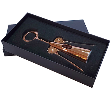 Descorchador de vinos electro plateado en color cobre. Presentación en estuche de cartón laminado con cuna interior de terciopelo. Tamaño: 12 cms. x 2.3 x 1.3 cms.