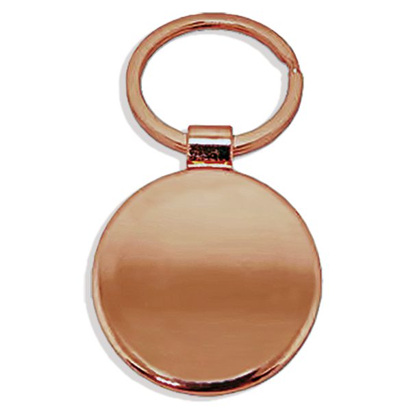 Llavero tapa destapador metálico electro plateado en color cobre. Presentación en estuche de cartón laminado color negro con cuna interior de terciopelo. Tamaño: Ø40 x 10.7 mm. Tamaño placa: 13.3 x 35 mm.