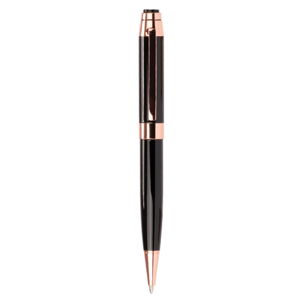 Bolígrafo metálico electro plateado en color cobre y negro de finas terminaciones. Acabado brillante. Escritura azul.Regalar un bolígrafo ejecutivo metálico encobrizado como promocional ofrece larga duración, alta percepción de valor y duraderos impactos de marca, asociando tu empresa con profesionalismo y éxito, siendo un regalo útil y memorable que refuerza relaciones comerciales, genera confianza y se convierte en un recordatorio constante de tu logo en manos de clientes y empleados. Su construcción metálica garantiza resistencia y una vida útil prolongada, extendiendo el tiempo que tu marca está expuesta con cada uso.