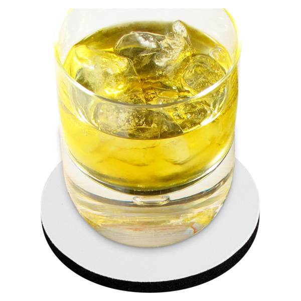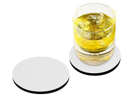 Posa vaso redondo de 5mm de espesor y 9cm. de diámetro, con base de silicona negra y cubierta de tela blanca Disponible también en cuadrado de 10x10 cm. para Sublimación.