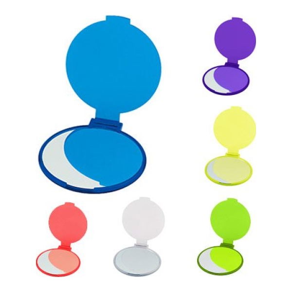 Espejo redondo de bolsillo, de plástico ABS, con tapa. Presentación individual en bolsita de polipropileno. 9.6 x 6 x 1 cm.