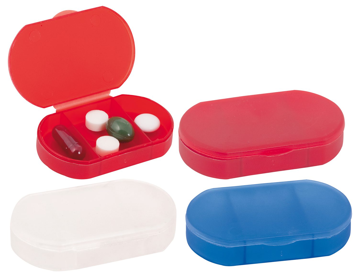Pastillero modelo "Bizone" de PVC traslúcido, con 2 compartimentos. 5.9 x 3.5 x 1.3 cm.