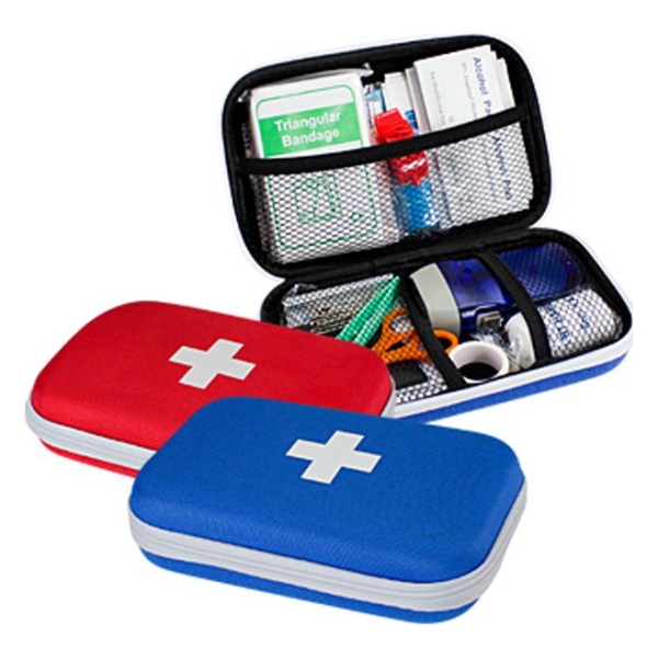 Kit de Primeros Auxilios en Estuche rígido de tela. Contiene 49 accesorios: 1 cabestrillo triangular, 1 linterna dínamo, 1 pito, 1 cinta adhesiva, 1 mascarilla, 4 toallitas húmedas antisépticas, 5 sobres con gaza estéril, 10 alfileres de gancho, 1 manta térmica plateada, 1 pinza, 1 multi-herramienta tarjeta metálica con funda, 1 banda PBT, 1 tijera, 10 toallitas húmedas con alcohol, 10 parche curitas. 20.5 x 13.5 x 5.1 cm.