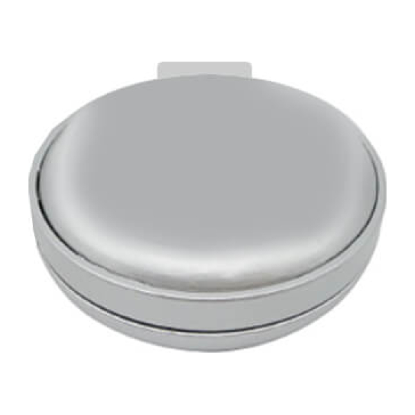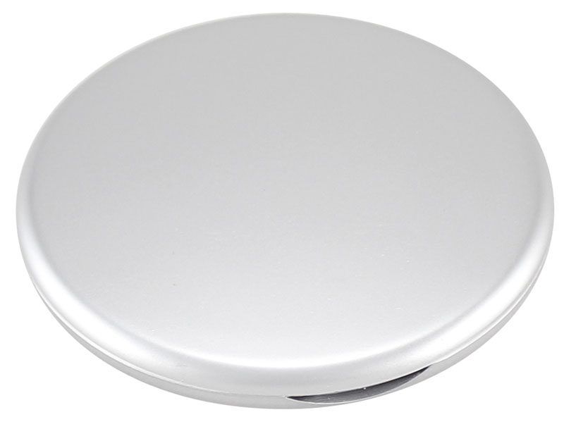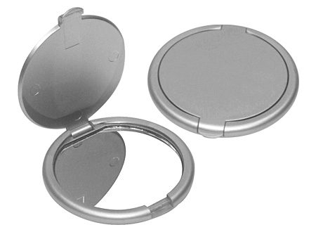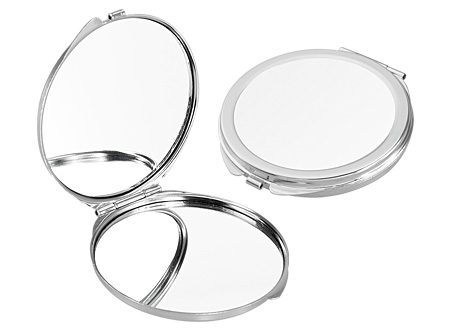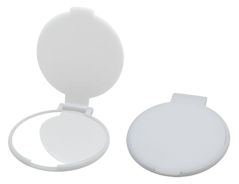 Espejo metálico redondo doble, con tapa, con círculo para Sublimación. Presentación en caja laminada blanca.Tamaño: Ø 6 x 0.9 cm / Círculo blanco para sublimación Ø 5 cm.