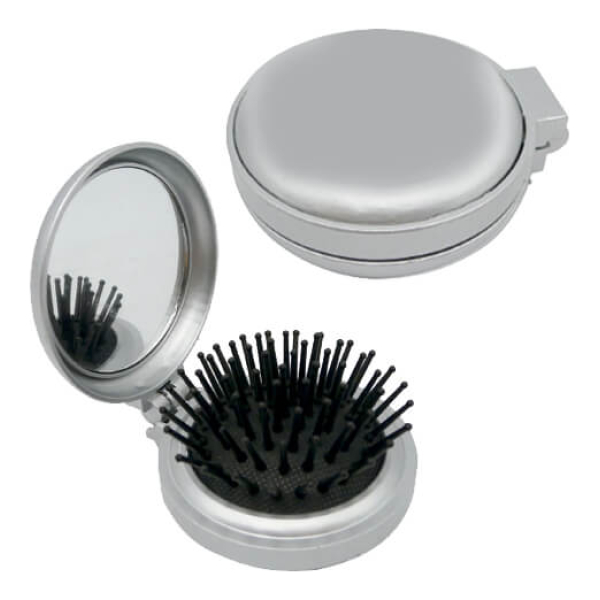 Útil y portátil set de espejo y peine perfecto para traer en la cartera. Diámetro 65 mm Plástico de Color Gris Goma de peine color negro Presentación en Caja de Cartón Negra.Regalar un espejo y peine portátil como obsequio promocional es una estrategia efectiva porque combina practicidad, visibilidad constante de la marca y un recuerdo positivo, ideal para el cuidado personal diario, especialmente entre mujeres, aumentando la conexión con la marca al ser un artículo útil y de uso frecuente en bolsos y viajes, fortaleciendo la imagen corporativa como detallista. Se usa en cualquier lugar (bolso, oficina, viajes), llevando tu marca a donde vaya el usuario, generando exposición constante.