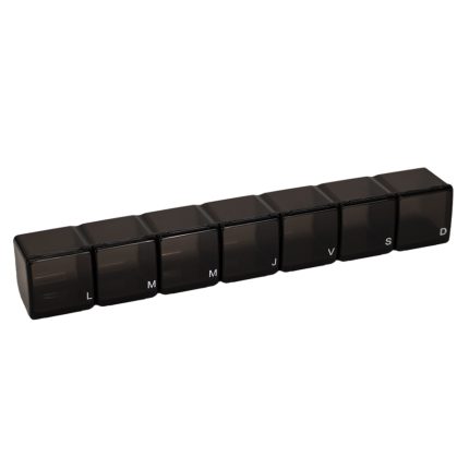 Pastillero Plástico de PVC «TREN», con 7 compartimentos interiores, identificados y ordenados con las iniciales de los 7 días de la semana. Presentación el bolsa blanca biodegradable + caja de cartulina blanca. Tamaño: 23 x 3.5 x 3.2 cm.