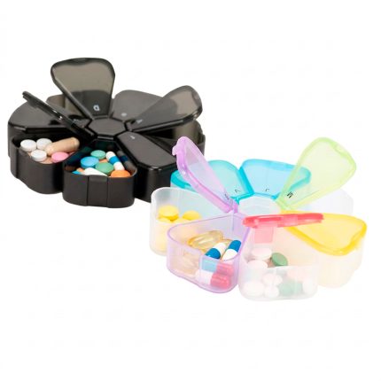 Pastillero Plástico de PVC «FLOWER» con forma de flor, con 7 compartimentos triangulares de diferentes colores translúcidos, identificados y ordenados con las iniciales de los 7 días de la semana. Presentación el bolsa blanca biodegradable + caja de cartulina blanca. Tamaño: 12 x 12 x 2.4 cm.