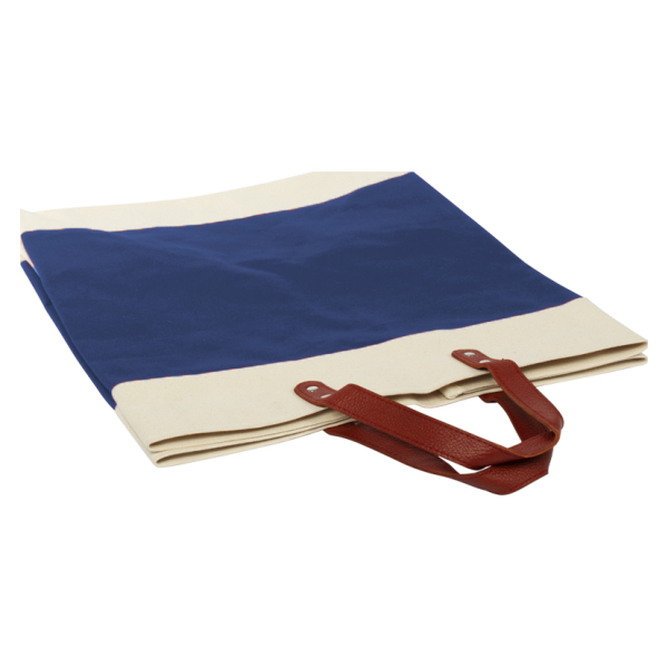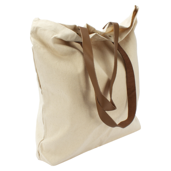 Bolsa de Compras con asas de cuero, en tela Canvas Algodón laminado natural de 10oz. (280 g/m2). Contiene doble manilla de Cuero natural, 8 remaches color bronce envejecido y cierre interior imantado.44 x 44 x 8 cm. aprox. / Manillas de 64 x 2.5 cm. aprox. c/u.
