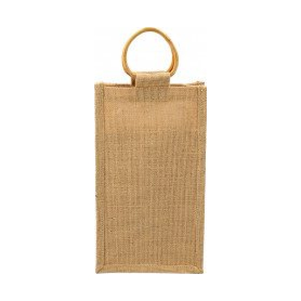 Bolsa promocional doble hecha con fibras de yute y manillas de bambú. Las fibras de yute entregan una presentación rústica y llamativa excelente para resaltar los atributos naturales de este tipo de productos. 35x20x10.La bolsa de yute para dos botellas de vino es ideal como regalo promocional por su presentación rústica y natural, que comunica sostenibilidad y buen gusto, protegiendo a la vez las botellas con separadores y permitiendo personalización con logo para branding, siendo una opción funcional, ecológica y memorable para eventos o clientes, resaltando la marca con un toque de clase y autenticidad. El yute ofrece una estética natural y elegante que eleva el regalo, haciéndolo parecer más especial y cuidado que una bolsa de plástico.