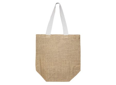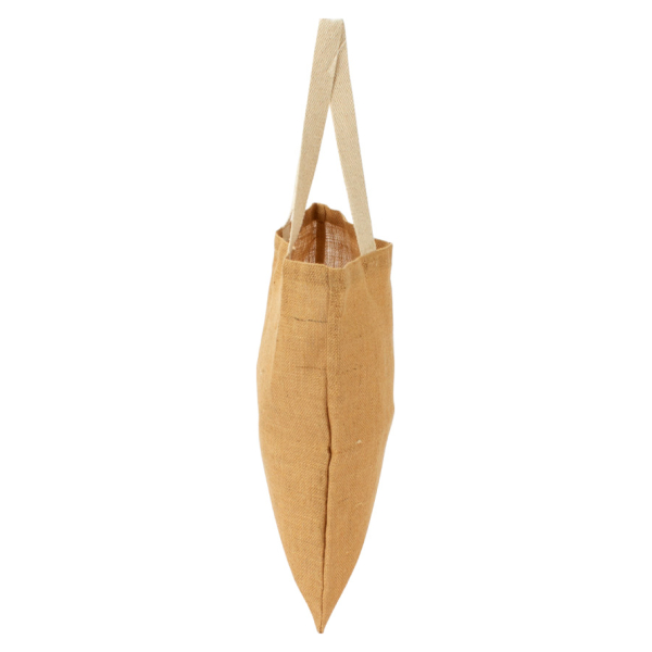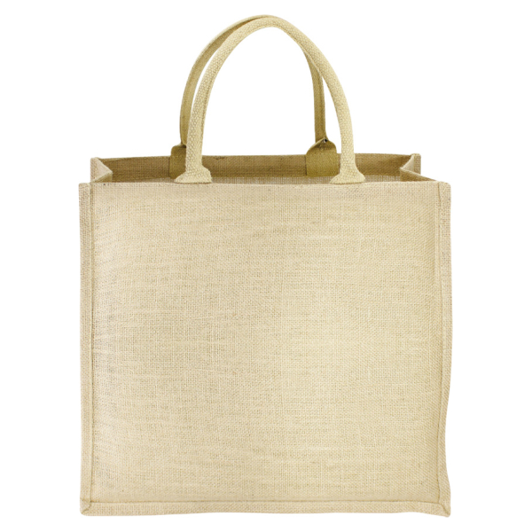 Bolsa de Yute modelo "Shangri-La", con recubrimiento laminado interior. Fuelle de yute. Manillas de cordón acolchado de yute de 40 x 1.5 cm. aprox. c/u. 39x36x15 cm.La bolsa de yute con manillas acolchadas y laminado es un excelente regalo promocional por su resistencia, durabilidad y carácter ecológico, ideal para compras o uso diario, que ofrece una imagen rústica y natural a la marca, siendo muy práctica para transportar productos medianos y más pesados que las bolsas de plástico, además de ser personalizable para branding, reforzando un mensaje de sostenibilidad a clientes y colaboradores. El yute es una fibra natural, biodegradable, lo que alinea la marca con prácticas responsables y ecológicas, un valor muy apreciado actualmente.