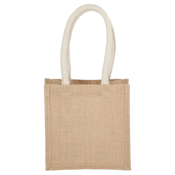 Bolsa reutilizable hecha con fibras de yute y manillas de cordón de algodón grueso. Las fibras de yute entregan resistencia y durabilidad además de una presentación rústica y llamativa. 20x20x15.
