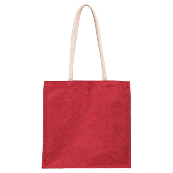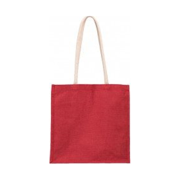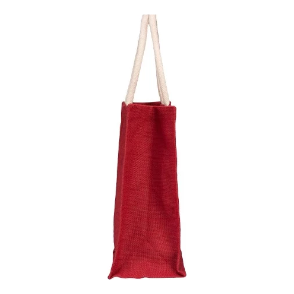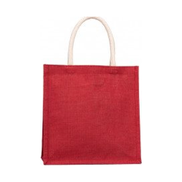 Bolsa reutilizable hecha con fibras de yute en color rojo. Tamaño ideal para compras diarias gracias a su fuelle y manillas gruesas de algodón. Las fibras de yute entregan resistencia y durabilidad además de una presentación rústica, llamativa y natural.33x33x15.