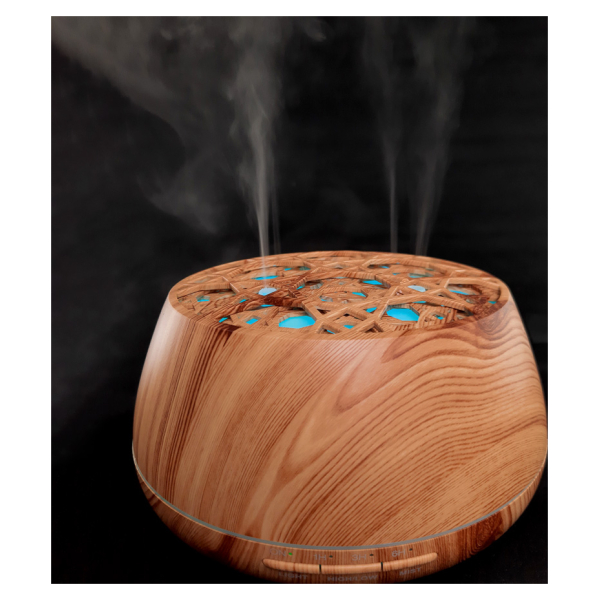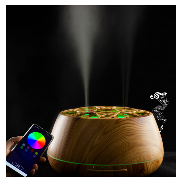 Difusor de Aroma con proyección de luz y parlantes. Contiene conexión Bluetooth para escuchar música desde el celular. También contiene APP para controlar colores e intensidad de aroma. Amplio contenido interno para líquido (hasta 300ml), diseño de proyección y colores variados de iluminación, atractivo formato en simil madera natural vetada. Un producto para disfrutar y relajarse, que no puede faltar en tu hogar u oficina.Tamaño: D17.5 x 9 cm. aprox.