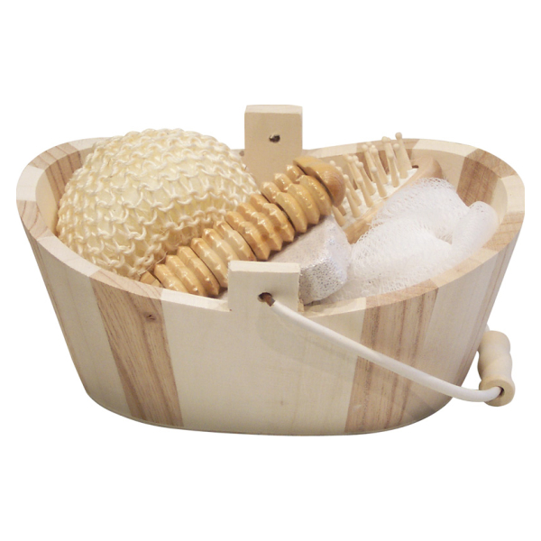 Canasto SPA de belleza en madera modelo «Naturals». Contiene cepillo de pelo, esponja malla, masajeador de madera, piedra pomez y esponja de masaje corporal.