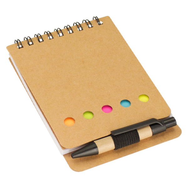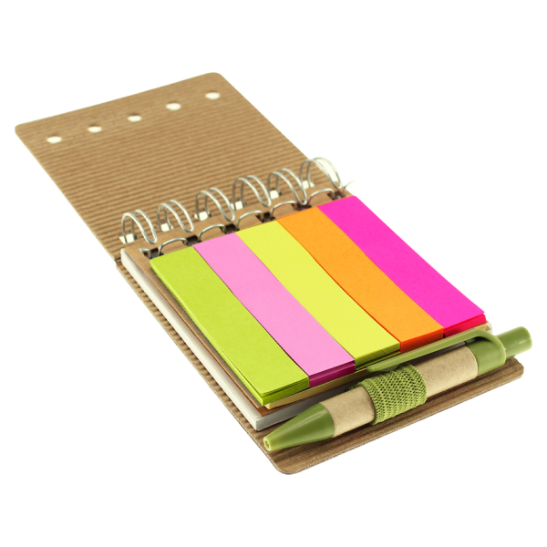Memo Set Ecológico con Bolígrafo Memo Set Ecológico. Incluye Bolígrafo Ecológico corto + 125 banderitas adhesivas de colores + 25 notas adhesivas cuadradas + Block de Notas 40 hojas blancas. Tapas gruesas cartón ecológico 600gsm, exterior liso/interior plisado, en Espiral Doble Cero Metálico.8 x 10.5 x 1.5 cm.