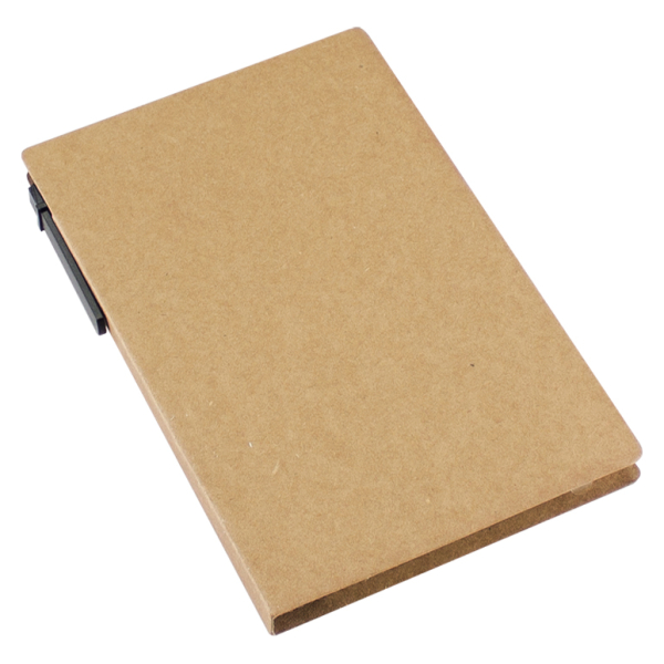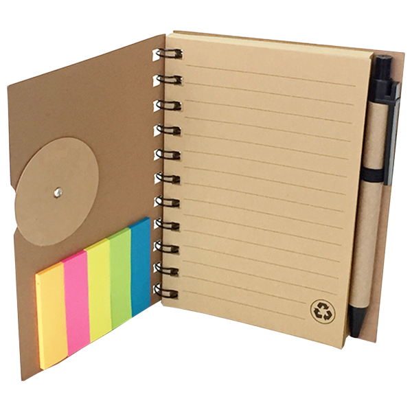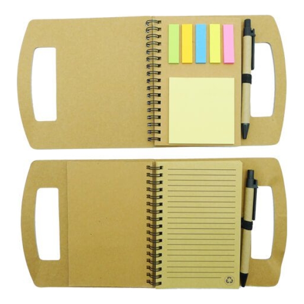 Memo set ecológico libreta con anillado doble cero metálico. Incluye set de post-it, bloc de notas y bolígrafo ecológico. Tapa de cartón troquelado con manilla. 125 Flag Post-it.  25 Post-it bloc de notas. 70 hojas lineadas papel kraft 70 grs, impreso signo reciclaje.16 × 15.5 × 1.5 cm.