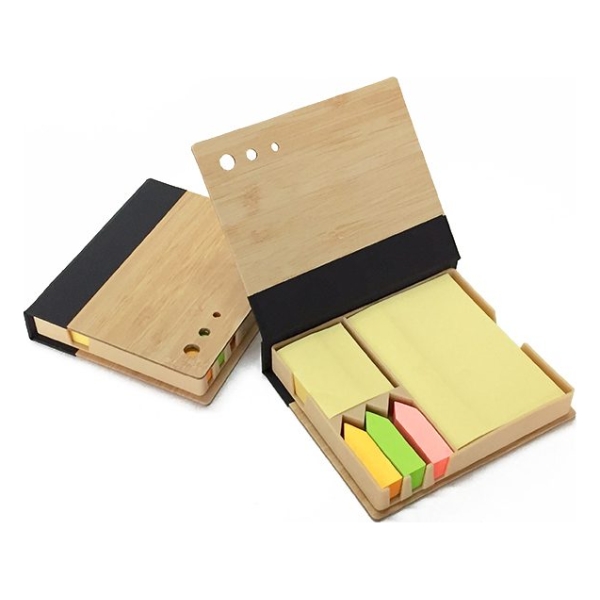 Memo set ecológico con tapa de bambú. Incluye set de post-it de diferentes tamaños. Detalles de tela, interior de plástico con divisiones.12 × 10.5 × 2 cm. 420 Flag Post-it. 140 Post-it medianos. 140 Post-it grandes.
