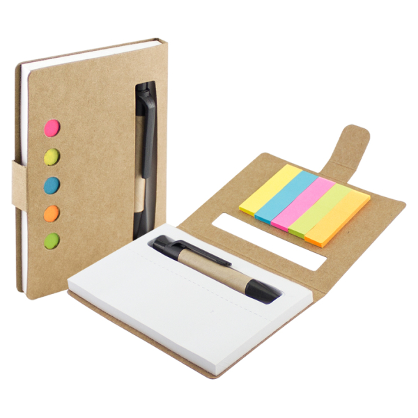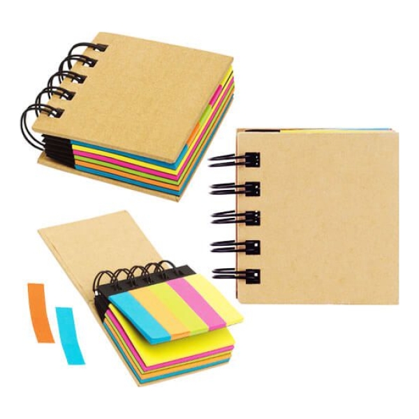 Memo set ecológico de oficina que incluye set de post-it de distintos colores. Anillado metálico doble cero. Tapa de cartón reciclado color natural 500 grs. 100 Post-it flag post-it y 100 Post-it cuadrados.