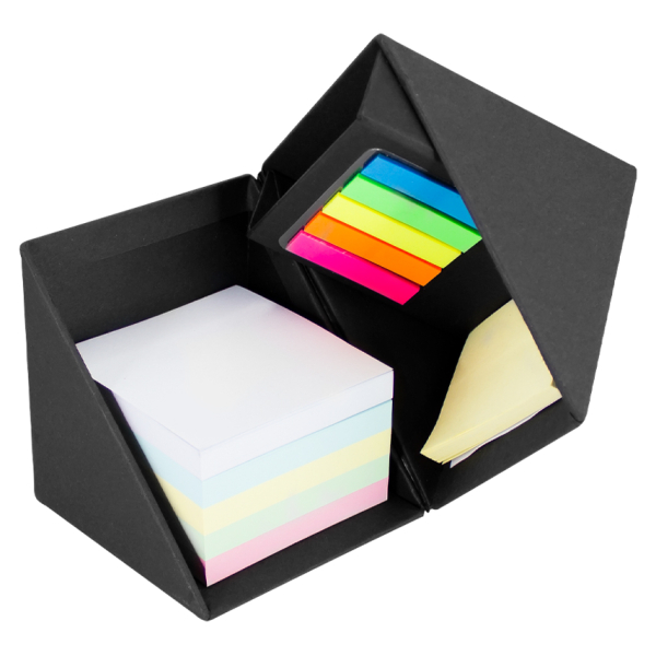 Memo set Ecológico retráctil con forma de Cubo en Cartón. Incluye 500 hojas de notas cuadradas de colores, 50 notas adhesivas amarillas medianas, 125 banderitas adhesivas de colores y un compartimento porta-lápices.