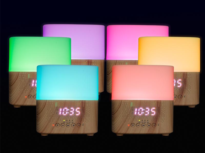 Difusor de Aroma con iluminación, reloj-alarma y parlantes. Contiene conexión Bluetooth para escuchar música desde el celular. Incluye juego de 7 luces LED rotativas de color, o bien se puede fijar cualquier color. Amplio contenido interno para líquido (hasta 300ml). Un producto para disfrutar y relajarse, que no puede faltar en tu hogar u oficina. Tamaño: 13.2 x 10.3 x 14.6 cm.