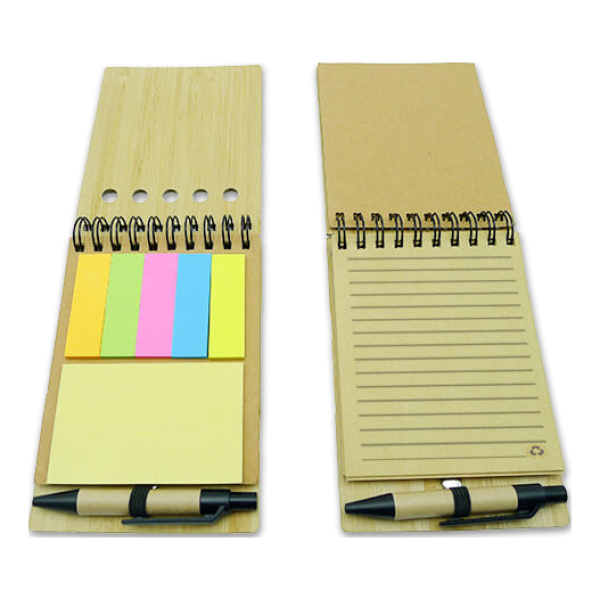 Memo set ecológico libretita con tapa de bambú que incluye set de post-it y bolígrafo promocional.12.8 × 9 × 2 cm. 125 Flag Post-it. 25 Post-it medianos. 60 Hojas papel Kraft 70 grs. con líneas y signo de reciclaje.