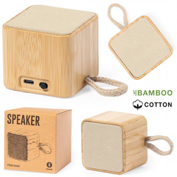 Altavoz inalámbrico con conexión Bluetooth® y 3W potencia. Con carcasa en bambú natural en combinación recubrimiento superior de algodón. De tamaño compacto y con práctica asa de transporte en algodón. Batería de litio de 300mAh, con cable de carga Tipo C incluido. Presentado