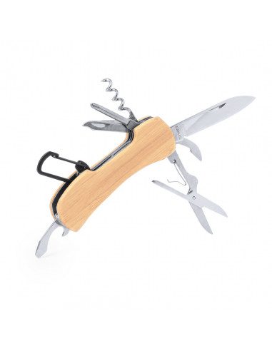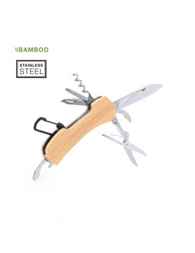 Navaja multiusos fabricada en acero inox y suave bambú. Con 9 funciones que incluyen cuchillo, tijeras, abrelatas, sacacorchos, destornillador philips, destornillador plano, lima y abrebotellas. Además, cuenta con un práctico enganche en forma de mosquetón. Presentada en caja de diseño kraft. Materiales como el bambú fomentan la utilización de materias primas naturales, reduciendo las emisiones contaminantes. Proviene de una planta de gran resistencia y versatilidad, con crecimiento y regeneración rápidos, siendo una excelente alternativa al uso de madera tradicional. 9 Funciones (Pedido mínimo 50 unidades)