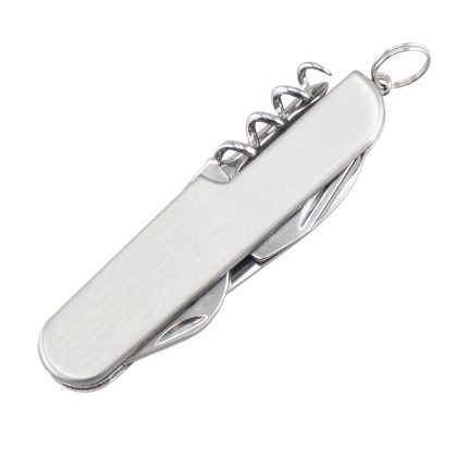 Multi - herramienta metálico de acero inoxidable con sacacorchos, destapador y cuchilla para abrir sellos. Presentación en bolsa plástica dentro de caja de cartón plateada.12 × 2 × 1.2 cmProducto agregado con éxito a la lista de cotizaciones
