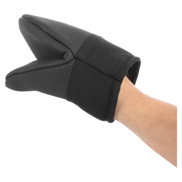 Mitón de Microfibra negra 70g/m2, con refuerzo de goma anti flama, para horno y parrilla. Tamaño: 15 x 14 cm.Producto agregado con éxito a la lista de cotizaciones