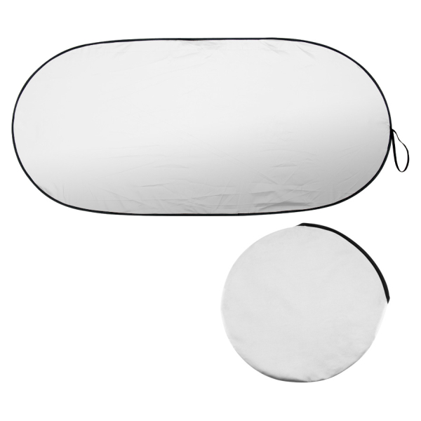 Parasol plegable de nylon plateado para el vehículo. Presentación dentro de funda redonda de nylon plateado. Gran área para impresión. Tamaño: Parasol 130 x 60 cm / Funda Ø 35cm aprox.Producto agregado con éxito a la lista de cotizaciones