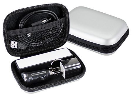 Kit de Conexión para el Automóvil. Contiene cargador USB para encendedor / toma de corriente del automóvil, Power Bank de 2500 mAh, toma-corriente con terminal USB y multi-cable adaptador USB de 1m de largo, con 3 terminales para iPhone / Samsung / Type C. Presentación en estuche EVA pouch plateado con interior negro, en caja de cartulina plateada.