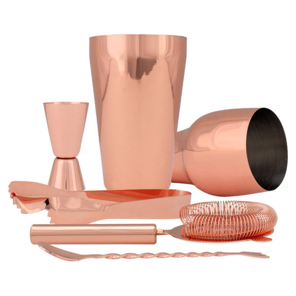 Fino regalo set de cóctel 5-en-1 de Acero inoxidale 304 SS, en acabado color cobre, incluye: coctelera 700ml con tapa 22cm, vaso dosificador doble (jugger) 8.3cm, tenazas para hielo 16cm, cuchara-tenedor revolvedor 23cm, colador/batidor 19cm. Producto BPA FREE, para el contacto con líquidos y alimentos. Capacidad coctelera 700ml. Presentación en caja de regalo de cartón laminado negro. Tamaño: Coctelera D8.7 x H22 cm. / Caja 10.6 x 10.6 x 23.6 cm. •Capacidad: 700 ccRegalar un set de coctelería encobrizado como regalo promocional es una excelente estrategia porque combina lujo y tendencia (el cobre es elegante y moderno), ofrece utilidad práctica para crear tragos en casa (coctelera, medidor, etc.), promueve la marca de forma duradera (un regalo útil se usa y se ve), y genera una experiencia premium, asociando la marca con momentos de disfrute, sofisticación y buen gusto, ideal para clientes VIP o eventos especiales. El acabado cobrizo es sinónimo de lujo, calidez y tendencia, haciendo que el regalo destaque y se perciba como un obsequio de alta gama.