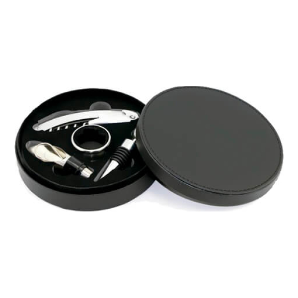 Set de vino en estuche símil cuero que incluye sacacorchos, argolla anti-goteo, tapón para vino y vertedor de vino. Presentación en caja de cartón duro negra. Sacacorchos (acero inoxidable). Anillo de vino (acero inoxidable). Tapón de vino (aleación de zinc, cromado). Vertedor de vino (acero inoxidable).Producto agregado con éxito a la lista de cotizaciones
