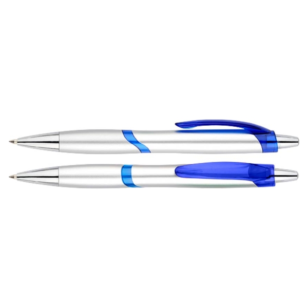 Bolígrafo plástico plateado con goma de color, modelo "Wind Satin". Escritura Azul. El Bolígrafo más famoso del mundo.
