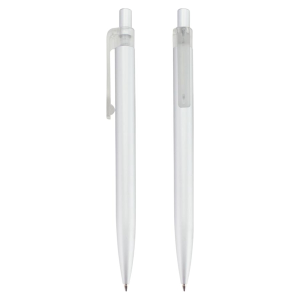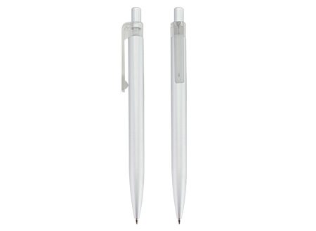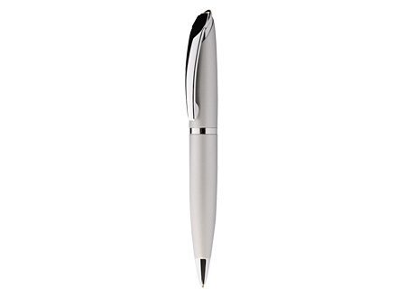 Fino bolígrafo Metálico blanco modelo "Trooper", con terminales metálicos. Diseño simple y moderno. Escritura azul.