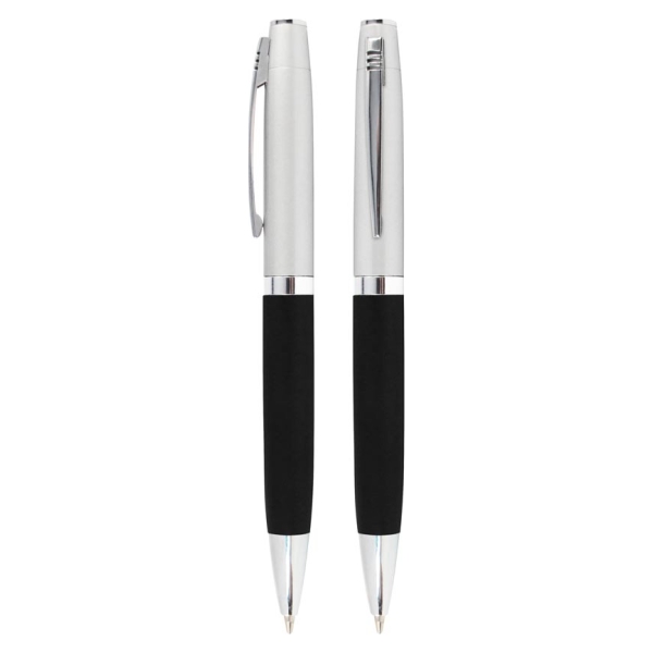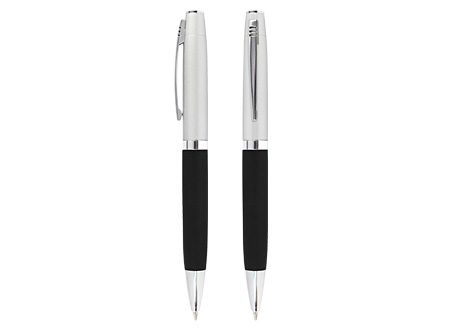 Bolígrafo Metálico bicolor modelo "Chairman". Cuerpo inferior superficie engomada negra, cuerpo superior plata satinado, terminales cromados. Escritura negra.