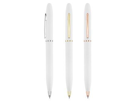 Fino bolígrafo Metálico blanco modelo «Trooper», con terminales metálicos. Diseño simple y moderno. Escritura negro.Regalar bolígrafos ejecutivos como obsequio promocional genera reconocimiento y fidelidad de marca al ser un artículo útil y duradero que mantiene tu logo visible diariamente, proyecta una imagen de calidad y prestigio, fortalece relaciones comerciales con clientes y socios, y es una forma económica de publicidad constante, especialmente en eventos, asociando tu marca con profesionalismo y aprecio. Se convierte en un recordatorio constante de tu empresa en escritorios, reuniones y en el día a día, aumentando la recordación de tu logo y eslogan.