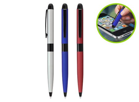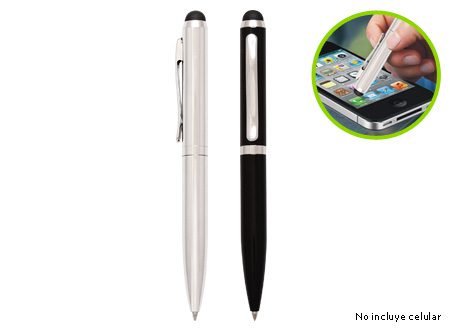 Bolígrafo "Touch-Screen" con cuerpo plateado, tapa de color metalizado y goma posterior negra para pantalla táctil. Incluye práctico soporte plástico para insertar en la salida de auricular del iPhone. Escritura azul.Tamaño:8.5 x Ø 1 cm.