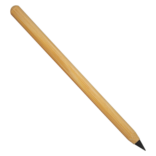 Lápiz eterno ecológico de madera de Bamboo, con interior de Carburo de Tungsteno y punta de 0.5mm de espesor. Contiene tapa plástica de PP translúcido. Escritura negra tipo lápiz grafito, se borra normalmente con goma de borrar común.Producto agregado con éxito a la lista de cotizaciones