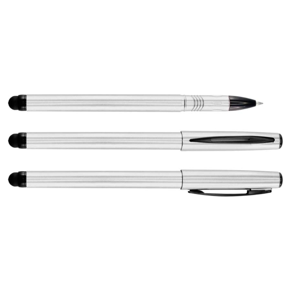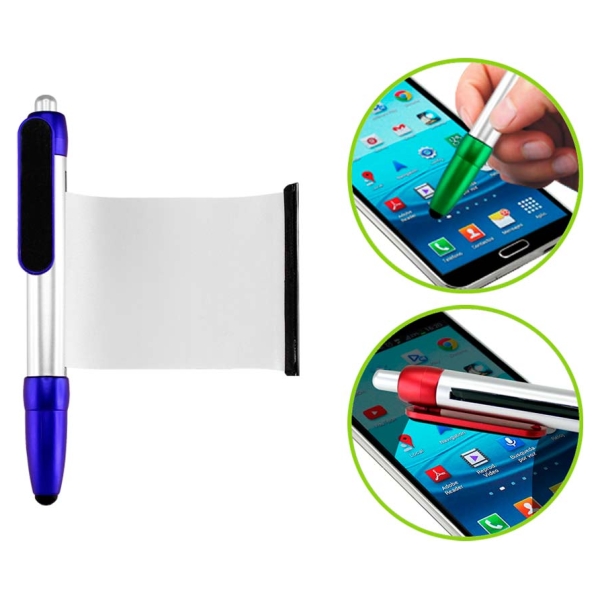 Bolígrafo "Touch-Screen" con cuerpo plateado, tapa de color metalizado y goma posterior negra para pantalla táctil. Incluye práctico soporte plástico para insertar en la salida de auricular del iPhone. Escritura azul.Tamaño:8.5 x Ø 1 cm.