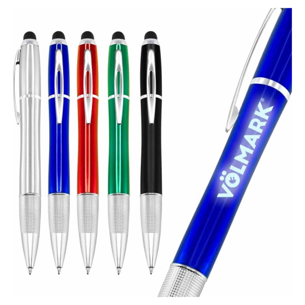 Bolígrafo plástico con puntero screen-touch al tono, modelo "NEON". Incluye luz LED al interior, para retroiluminar logo grabado sobre el cuerpo del bolígrafo. Escritura azul.