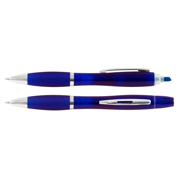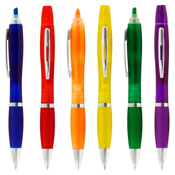 Bolígrafo plástico con cuerpo de color y puntero screen-touch al tono. Incluye práctico destacador (resaltador) de cera de color. Escritura azul.