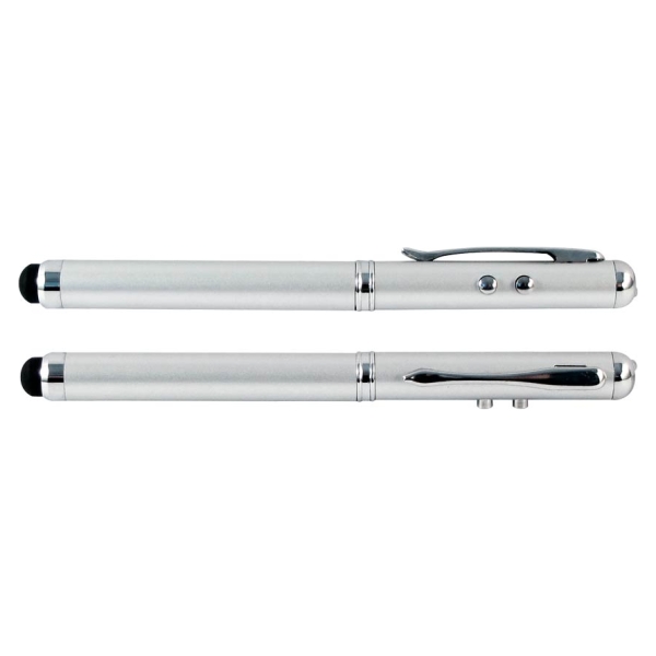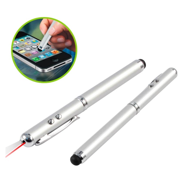 Bolígrafo metálico multi-función 4 en 1. Incluye bolígrafo, linterna LED, puntero láser y NUEVO puntero «Touch-Screen» para pantallas táctiles. Presentación en estuche de aluminio. Escritura Azul.