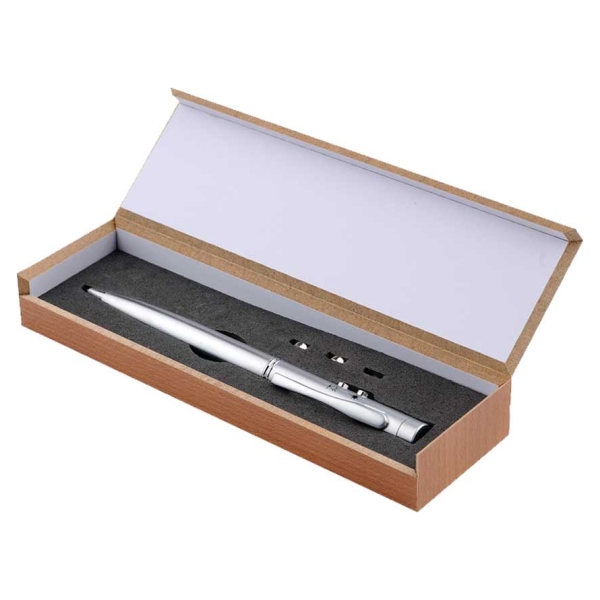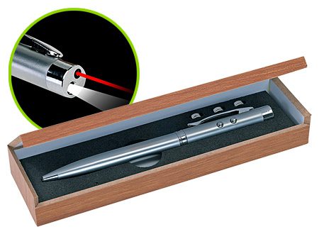 Bolígrafo metálico multi-función 3 en 1. Incluye bolígrafo, linterna LED y puntero láser. Presentación en estuche de madera.