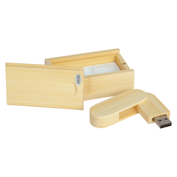 Deluxe USB Pendrive 3.0 de 64GB de capacidad, 100% en madera de Bamboo, con carcasa giratoria. Presentación en elegante estuche de madera de Bamboo.